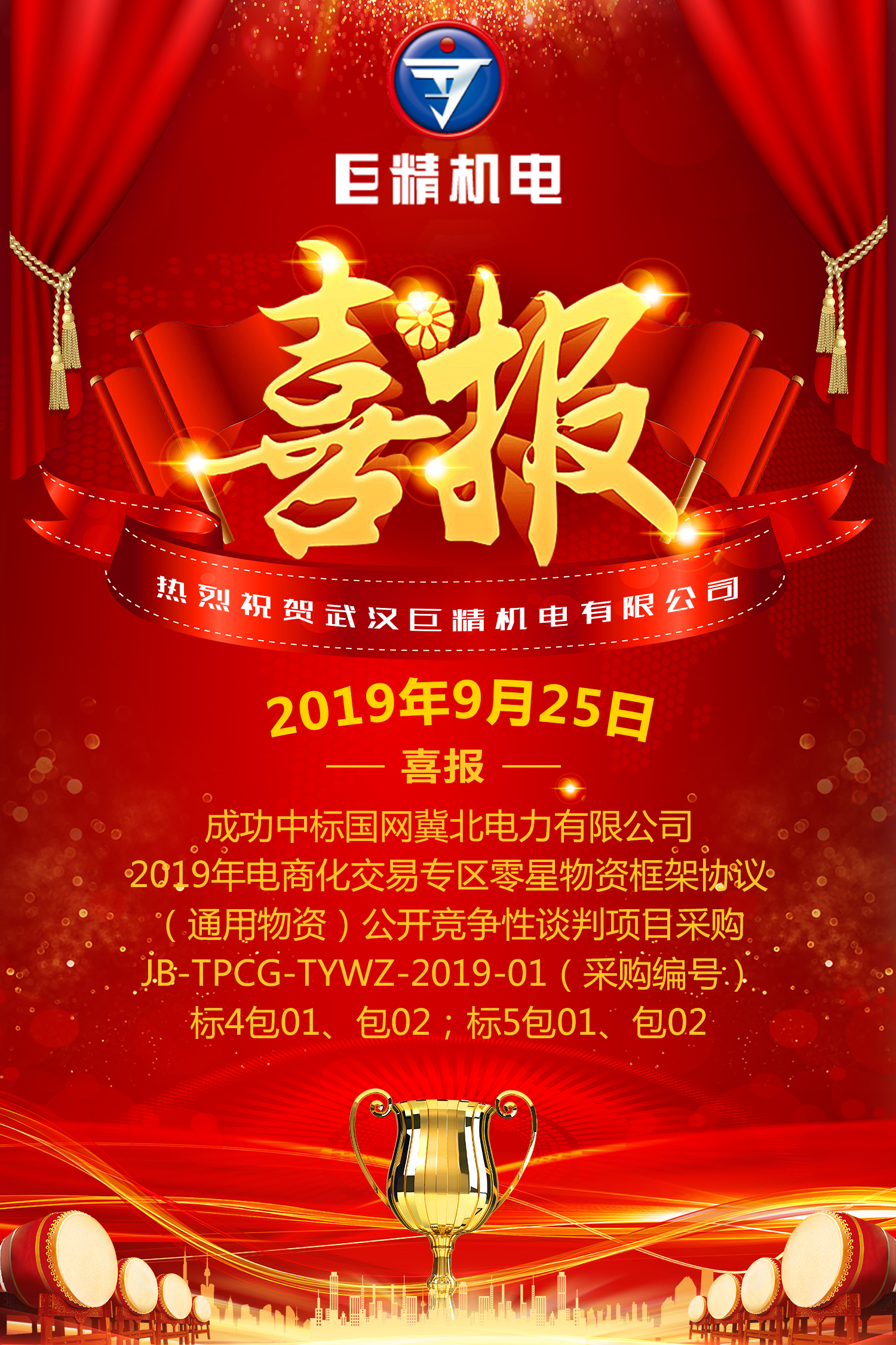 熱烈祝賀武漢巨精機電有限公司中標國網(wǎng)冀北電力有限公司2019年電商化交易專區(qū)零星物資框架協(xié)議(通用物資)公開競爭性談判項目采購 JB-TPCG-TYWZ-2019-01(采購編號)